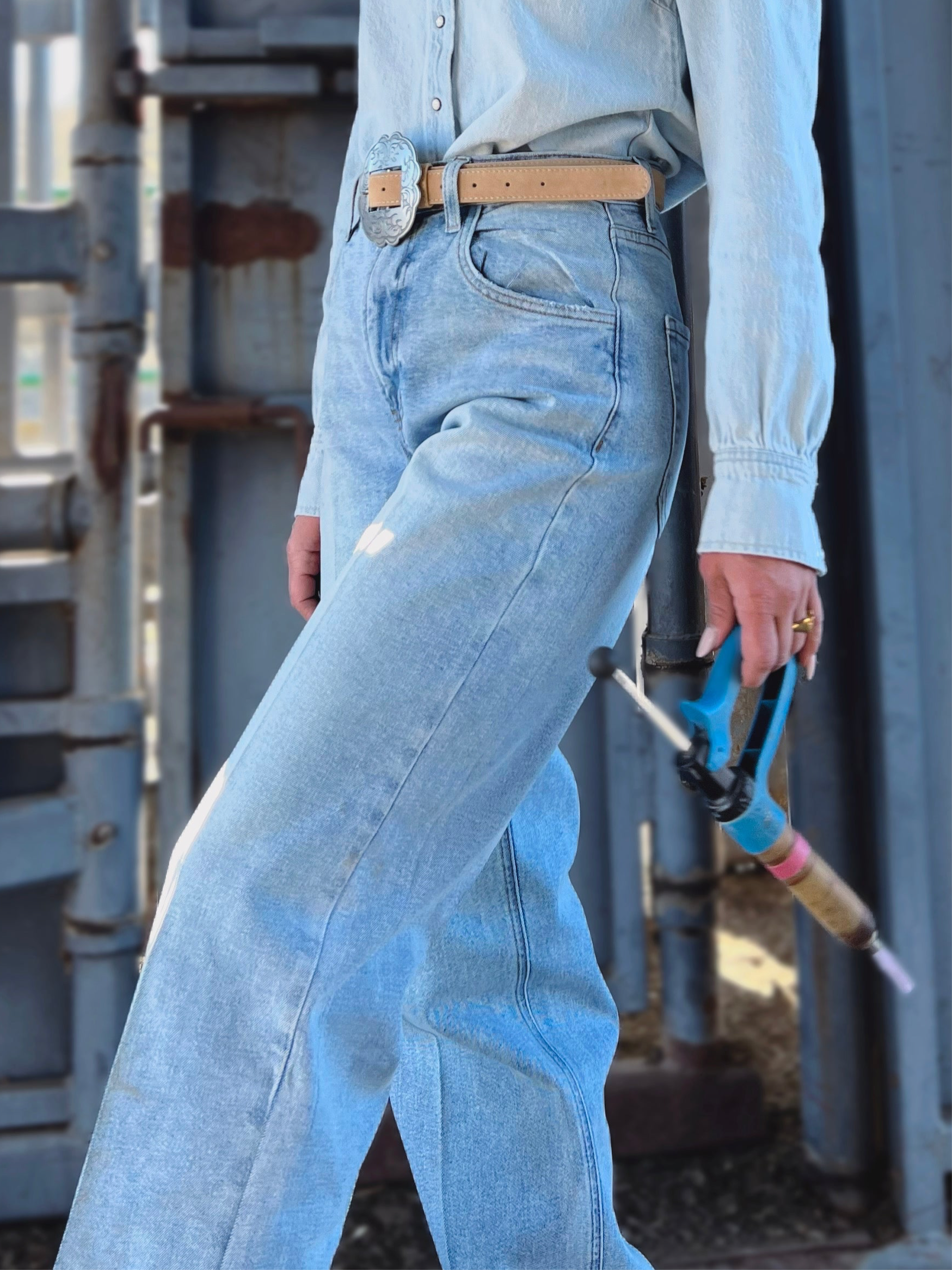 A pair of high-rise 90s baggy jeans featuring